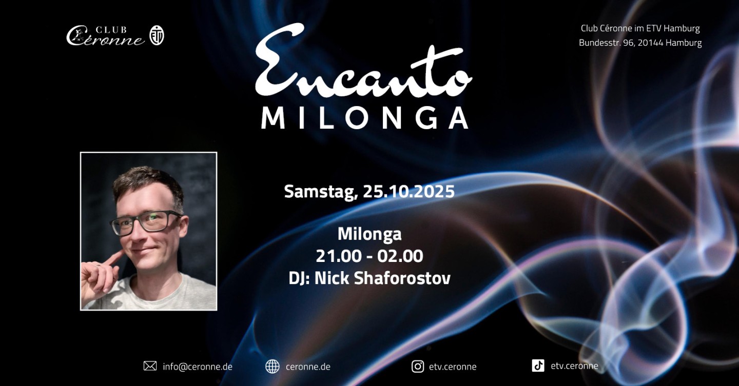Encanto Milonga – 20:00 bis 2:00 Uhr [ zurück ... ] Wir freuen uns sehr auf den 25.10. mit DJ Nick! Die charmante ENCANTO Milonga bietet jeden 4. Samstag die Möglichkeit sich tänzerisch ordentlich auszutoben. Im Club Céronne findet ihr riiiichtig viel Platz zum Tanzen (ca. 200qm), Schwingparkettboden und moderne Lichtanlage. Den kleinen Plausch zwischendurch könnt ihr entspannt in gemütlichen Sitzecken im Saal oder im abgetrennten Barbereich halten. DJs die im In- und Ausland unterwegs sind, sorgen mit traditioneller Tango-Musik für die richtige Stimmung und wunderbare Tandas. MILONGA 21.00 Uhr – 2.00 Uhr Eintritt: Normal-Preis: 12 € Ermäßigter Preis: 6 € Wir freuen uns auf Euch! Mail: info@nataliareichert.com Webseite: https://ceronne.de/milonga/ Veranstalter*in: Natalia Reichert[ alle Events von ] Ort: Club Céronne/ETV, Bundestraße 96, 20144 Hamburg [ Website ] [ Route hierher ] [ alle Events an diesem Ort ]