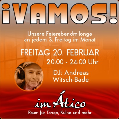 ¡Vamos! Im ATICO: Milonga mit TDJ Andreas 20. Februar 2026 – 20:00 bis 23:59 Uhr [ zurück ... ] Hamburgs Freitagsmilonga im ÁTICO Freitag, den 20. Februar MILONGA 20:00 – 24:00 Uhr Musik: Traditionell in Tandas u. Cortinas DJ: Andreas Witsch-Bade verwöhnt Euch mit wunderbarer Musik aus allen Epochen Eintritt: 10 € / Pers. Veranstalter*in: Das Ático[ alle Events von ] Ort: Das Ático, Krummholzberg 5, 21073 Hamburg [ Website ] [ Route hierher ] [ alle Events an diesem Ort ]